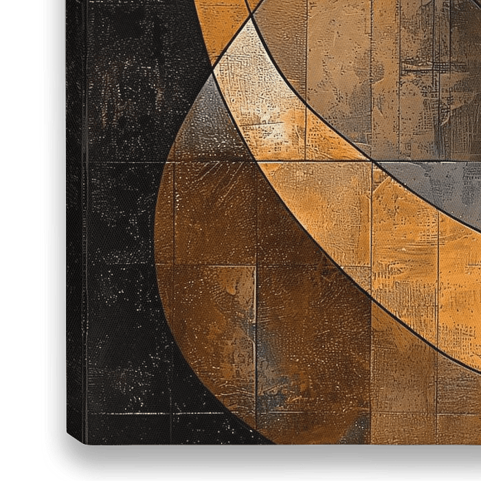 Abstract profiel portret van een vrouw met geometrische vormen en gedempte goud en aardetinten.