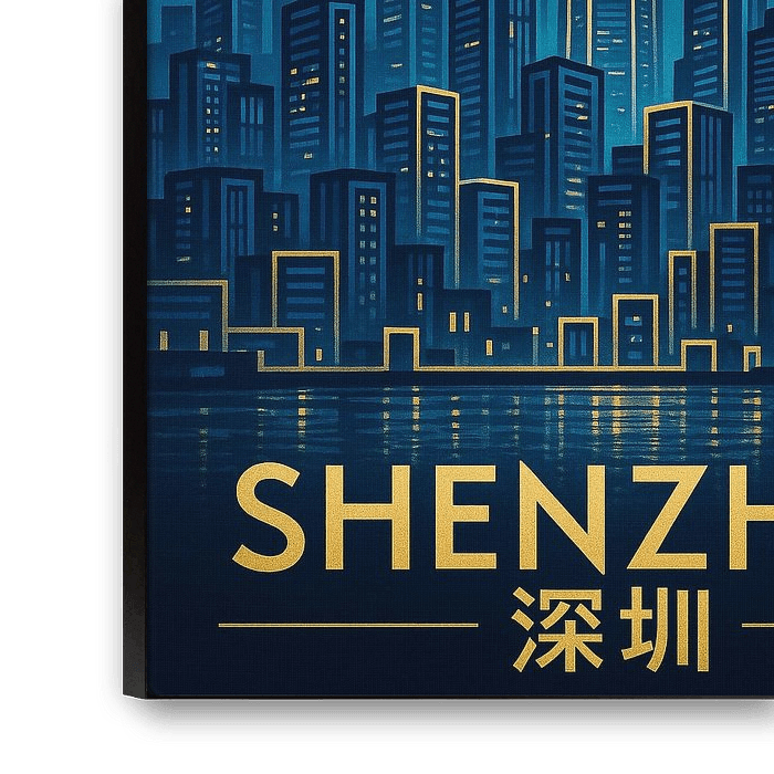 Dit kunstwerk vangt de gedurfde, futuristische essentie van Shenzhen - een stad die in slechts een paar decennia veranderde van een vissersdorp in een wereldwijde technologische krachtcentrale. De skyline rijst dramatisch op, gedomineerd door een slanke centrale toren die gloeit met scherpe gouden lijnen die de hoogte en precisie…