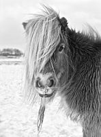 Deze Shetlander pony werd in het prachtige besneeuwde winterlandschap van de Bommelerwaard in de provincie Gelderland op een koude winterdag gefotografeerd.