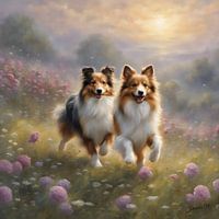 Dit levendige en grillige digitale kunstwerk legt de vreugde vast van een Shetland Sheepdog die speelt in een veld vol wilde bloemen. De speelse uitdrukking en energieke lichaamstaal van de hond zijn perfect vastgelegd en de heldere en vrolijke kleuren van de bloemen creëren een gevoel van geluk en zorgeloos plezier.