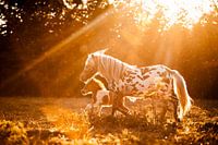 Shetland pony met veulentje tijdens zonsondergang op een warme zomerse avond