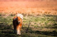 Shetlandpony in de gloed van zonsondergang. Warme tinten in Nationaal park de groote peel.