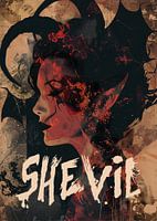 Een abstract schilderij met een vrouwelijke duivel. Het schilderij is in donkere kleuren en heeft de tekst "SHEVIL" eroverheen geschreven.