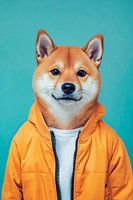 Een Shiba Inu met een charmante grijns en levendige, zijdeachtige vacht straalt een onmiskenbare persoonlijkheid uit. In een stijlvol, feloranje jasje gecombineerd met casual wit, belichaamt hij de perfecte mix van coolness en loyaliteit. Zijn nieuwsgierige blik geeft het beeld een speels tintje dat gewoonweg onweerstaanbaar is.