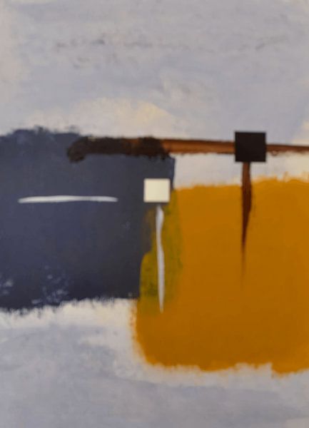 Dit abstracte schilderij speelt met asymmetrie en verschuiving. Een donker vlak links wordt in balans gebracht door een warm oker vlak rechts. De lijnen verbinden de compositie, terwijl kleine geometrische elementen zorgen voor spanning en focus. De zichtbare penseelstreken geven het werk een levendige uitstraling. Dit moderne kunstwerk…