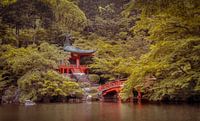 Prachtige Shingon boeddhistische tempel in Fushimi-ku, Kyoto, Japan. Gelegen aan het water steekt de rode brug en de rode tempel prachtig af. Een prachtig beeld zoals uit een sprookjesverhaal.