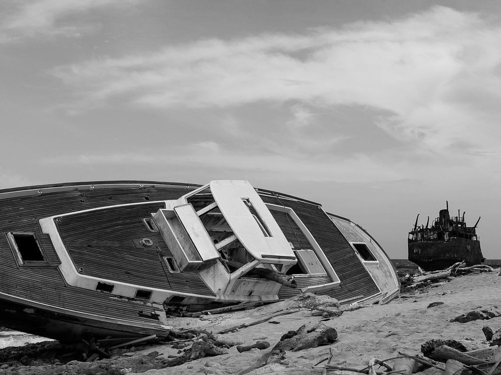 Twee Scheepswrakken op de kust van Klein Curacao. Op de voorgrond een zeiljacht, in de achtergrond een vrachtschip. Zwart/wit.