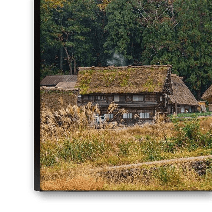 Deze foto laat het traditionele dorp Shirakawa-go in zijn meest dromerige gedaante zien. De karakteristieke gasshō-zukuri-boerderijen, met hun steile rieten daken als biddende handen, staan rustig in een gouden herfstlandschap. De voorgrond is gevuld met hoog gras en zachte aardetinten, terwijl achter de huizen een wand van cederbomen…