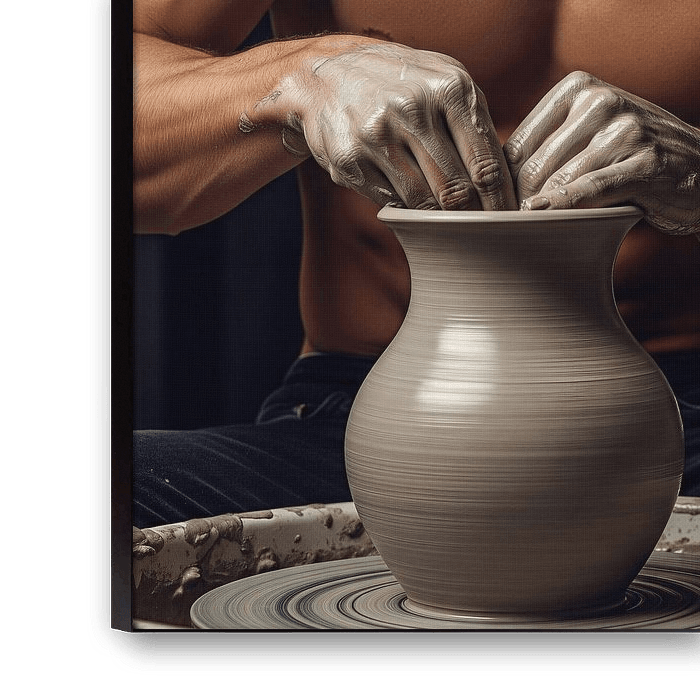 Een shirtloze man met met klei bedekte handen vormt een vaas op een pottenbakkersschijf. De focus ligt op de pot en het model.