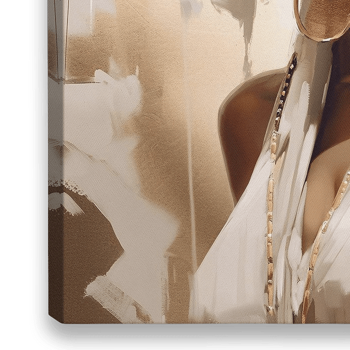 Abstract impressionistisch portret van een mooie Afrikaanse vrouw in mixed media stijl met grove penseelstreken op canvas in wit,beige en goud tinten.