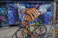 Een aantal gele en rode gekleurde fietsen staat geparkeerd op de stoep voor een met graffiti beschilderde muur in de populaire wijk Shoreditch, Londen, Verenigd Koninkrijk.