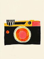 Een speels en stijlvol kunstwerk dat een retro camera in een modern, grafisch ontwerp vastlegt. De combinatie van warme tinten zoals roze, geel en oranje met het diepzwarte silhouet van de camera creëert een krachtig contrast dat direct de aandacht trekt. De minimalistische, bijna pop-art-achtige stijl geeft het werk een eigentijdse…