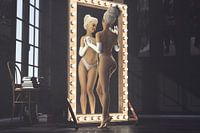 "Showgirl": Betreed de betoverende wereld van de showbusiness met dit geënsceneerde werk. Een prachtige showgirl, gehuld in glitters en veren, staat voor een grote spiegel backstage. Met een zelfverzekerde blik en elegante houding straalt ze pure kracht en passie uit.