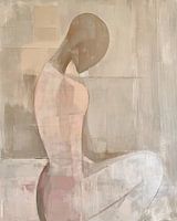 Figuratieve abstractie met het profiel portret van een verlegen vrouw in zachte naturel pastelkleuren op houtstructuur.