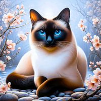 Dit betoverende digitale portretkunstwerk toont de serene schoonheid van een Siamese kat die rust in een dromerige bloementuin.