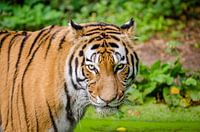 De afbeelding toont een close-up van een tijger. De tijger heeft een oranje vacht met zwarte strepen en witte accenten rond de ogen, snuit en onderkant van de nek. De ogen van de tijger zijn geel en kijken recht in de camera. Op de achtergrond is er groen gebladerte en gras te zien, wat suggereert dat de tijger zich in een natuurlijke omgeving bevindt. De foto is interessant omdat hij de majestueuze en krachtige uitstraling van de tijger vastlegt, een dier dat vaak wordt bewonderd om zijn schoonheid en kracht.