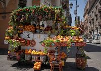 Deze foto is genomen in de 2e grootste stad van Sicilië, Catania. Waan je op straat bij een straatverkoper en voel de warmte op je huid. Geniet van een lekker glas versgeperste sinaasappelsap van Siciliaanse sinaasappels.
