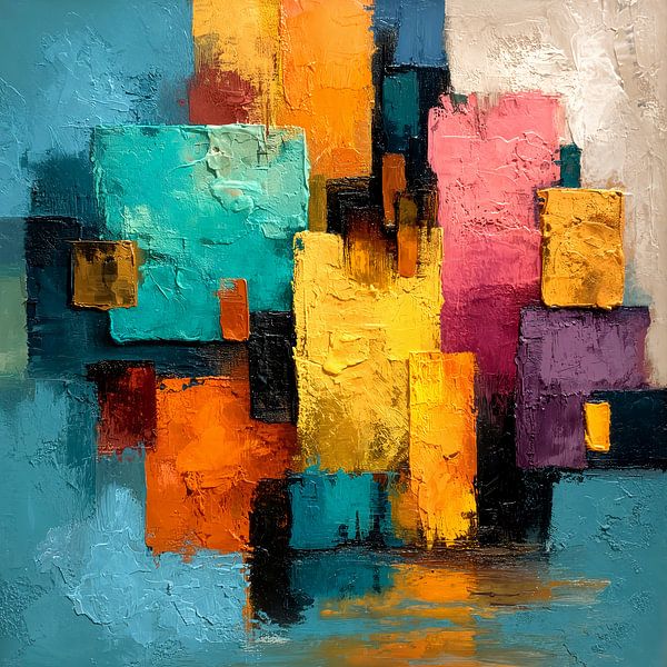 Een abstract kunstwerk met levendige kleurvlakken tegen een turquoise achtergrond. De vormen zijn in een dynamische compositie gerangschikt, met enkele overlappende en reflecterende lichtbronnen, wat een gevoel van diepte en beweging creëert. Het algehele effect is energiek en doet denken aan een moderne artistieke stijl.