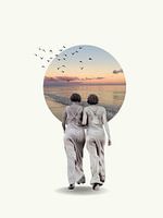 Twee vrouwen, samen op weg, tegen een rustige achtergrond van zee en lucht. Het beeld ademt eenvoud en nabijheid, met veel ruimte en licht.
