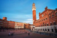 Das Foto zeigt einen Blick über den zentralen Hauptplatz Piazza del Campo (“Il Campo“) auf den Palazzo Pubblico mit seinem 102m hohen Torre del Mangia.