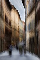 Siena de prachtige stad in Toscane gelegen in Italië. De winkelstraten met zijn oude woningen geven een echt warm gevoel door de prachtige warme kleuren. Deze foto is gemaakt door bewust te bewegen met de camera tijdens het maken van de foto om de personen onherkenbaar te maken zodat ik deze foto toch in m'n shop kon plaatsen. Straatfotografie. Deze foto zal door zijn warme kleuren een warme sfeer geven in de kamer waar ook je hem hangt.