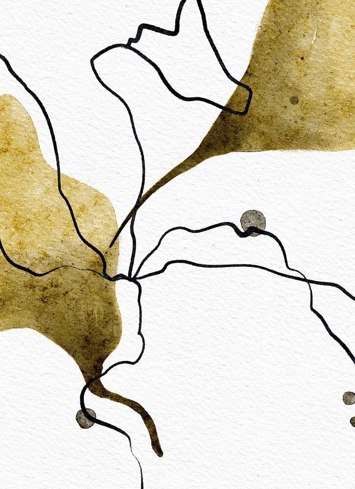 Het is een geabstraheerd beeld van bladeren, de lijn is in één intuïtieve beweging getekend, voortgevloeid uit mijn verbeelding en natuurlijk heb ik hierbij de prachtige natuur als basis genomen.