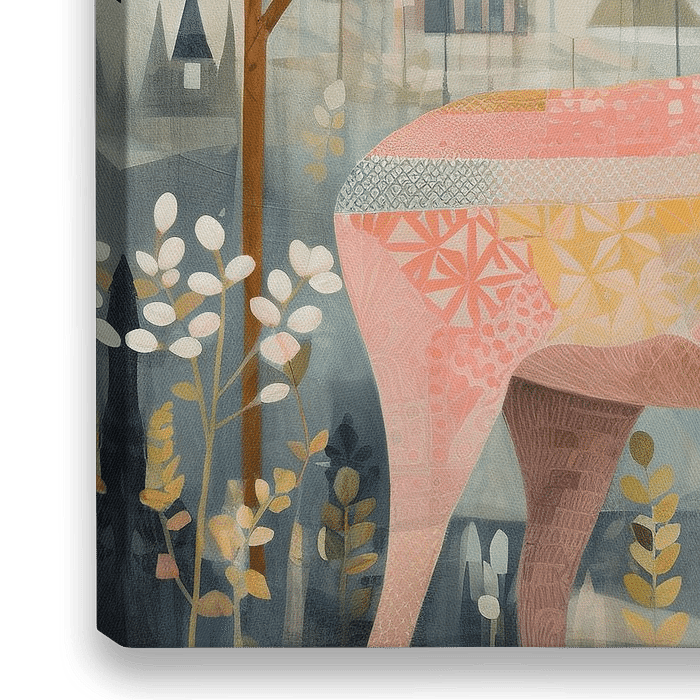 Sierlijk Hert - Centraal in dit stuk staat een sierlijk hert, gedetailleerd versierd met een keur aan patronen en kleuren die warmte en rust uitstralen. De achtergrond toont een subtiel geïllustreerde, pastorale scene, wat het geheel een vredige en bijna sprookjesachtige uitstraling geeft. De kleurrijke flora en de serene architectuur…