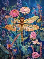 De donkere indigoblauwe achtergrond zet de felgekleurde bloemen in roze, paars en goudgeel in de schijnwerpers, wat zorgt voor een levendig contrast. De vleugels van de…