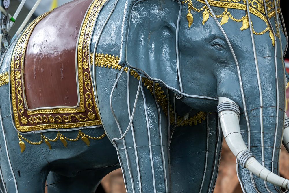 Een prachtig gedetailleerd standbeeld van een olifant, rijk versierd met traditionele Thaise motieven in goud en bruin.