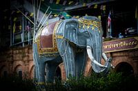 De olifant, een nationaal symbool van Thailand, staat majestueus afgebeeld met indrukwekkende slagtanden.