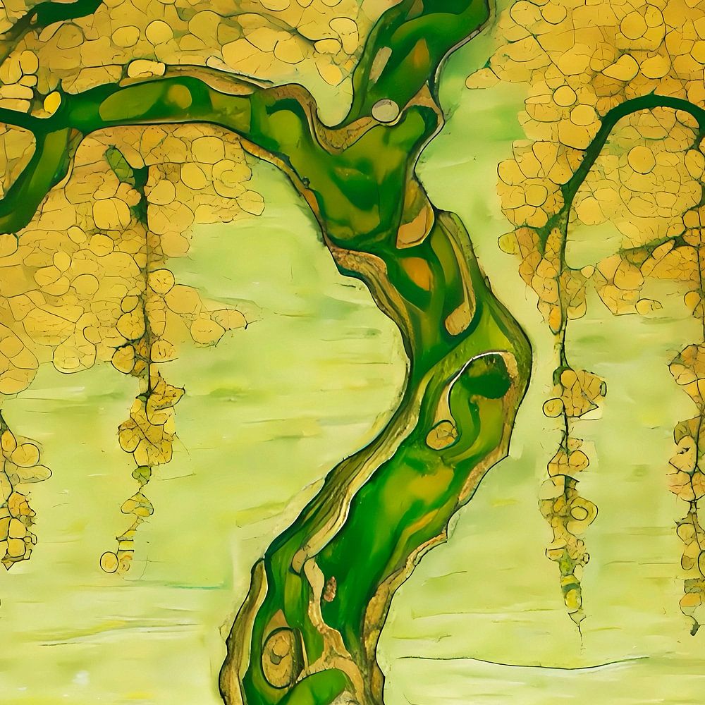 Het kleurpalet bestaat voornamelijk uit levendige groene en gele tinten, die een verfrissend en levendig gevoel toevoegen aan het tafereel. Dit kunstwerk brengt een serene rust en een gevoel van harmonie in elke ruimte waar het hangt.
