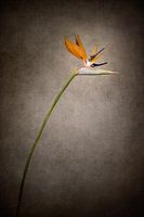 Strelitzia's verspreiden een prachtige tropische flair met hun fantastische bloemen. Buitengewoon decoratieve voorstelling van de paradijsvogelbloem in een minimalistische context. Expressief motief in vintage stijl.