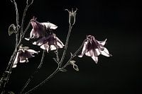 Een tros tere roze akeleibloemen (aquilegia) wordt uitgelicht tegen een donkere achtergrond, waardoor een contrast ontstaat dat de ingewikkelde bloemblaadjes en slanke stelen benadrukt. Zonlicht filtert door de bloemblaadjes, waardoor ze er doorschijnend uitzien en hun natuurlijke schoonheid versterken.
