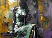 Details: vrouw, abstract, modern, figuur, zittend, kunst, schilderij, expressionisme, geel, paars