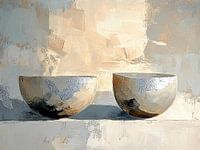 Silenced Echo - Dit stilleven schilderij toont twee halve bollen met glanzende en matte texturen op een zachte achtergrond van beige en grijsachtige tinten.