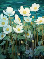 Silent Bloom Echo - Dit bloemenschilderij toont een reeks houtanemonen, weelderig en levendig tegen een rijk getextureerde donkergroene achtergrond, waarbij de bloemen elegant naar het licht reiken.