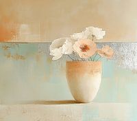 Silent Bloom Echo - Dit bloemen schilderij toont een vaas met delicate witte bloemen tegen een subtiel abstracte achtergrond in aardetinten en blauw.