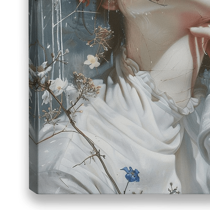 Silent Bloom Secrets - Dit vrouwen schilderij toont een portret van een vrouw wiens gezicht gedeeltelijk verborgen is door kleurrijke bloemen en takken, uitgevoerd in een gedetailleerde en surrealistische stijl met zachte pastelkleuren.