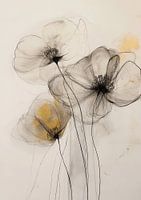 Silent Bloom of Gold - Dit bloemen schilderij toont drie grote, etherisch getekende papavers met delicate, transparante bloemblaadjes en donkere, spiraalvormige centra, subtiel aangevuld met goudkleurige accenten.