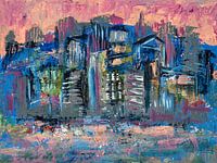 In het schilderij ‘Silent Cityscape’ staat een stad centraal in rustige blauwtinten, roze accenten en aardse kleuren. De gebouwen hebben een abstracte, vloeiende vorm en roepen een gevoel van verstilling op. De dikke verfstructuur en losse penseelstreken geven het werk een levendige, gelaagde uitstraling. De compositie heeft een kalme,…