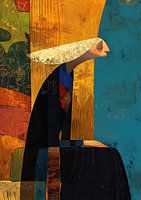 Silent Color Symphony - Dit vrouwen schilderij toont een abstracte, stilistische persoon met een groot, hoekig gezicht en een complex patroon van lijnen en kleuren over haar gewaad.