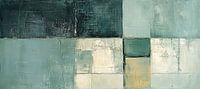 Silent Depths - Dit abstracte schilderij kenmerkt zich door een compositie van overlappende blokken in voornamelijk koele grijsgroene en zeegroene tinten, met een touch of roestkleur die een contrast biedt.