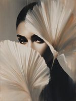 Silent Gaze vangt een moment van verstilling en introspectie. De blik, deels verborgen achter zachte, waaierachtige vormen, nodigt uit tot nieuwsgierigheid en interpretatie. Wat zichtbaar is, spreekt net zo sterk als wat wordt verhuld.