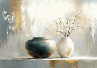 Silent Gold Harmony - Dit stilleven schilderij toont twee elegant gevormde vazen met een rustieke textuur tegen een abstracte, zachtgekleurde achtergrond met gouden en grijze tinten, waarbij de linker vaas donkergroen gekleurd is en de rechter vaas crème-wit, beide verfraaid met subtiele goudaccenten en gevuld met delicate, droge witte…