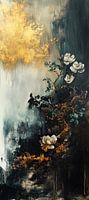 Silent Golden Bloom - Dit bloemen schilderij toont een dramatisch contrast tussen donkere, haast grijze en zwarte tinten, en heldere goudgele uitspattingen, waarbij de witte bloemen subtiel maar levendig afsteken tegen een donkere, bijna mystieke achtergrond.