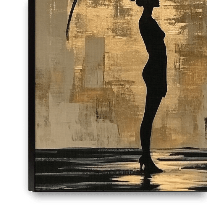 Een elegant silhouet van een vrouw staat in volledige rust onder een groot, schilderachtig blad dat als een poëtische gedachte boven haar zweeft. De gouden achtergrond geeft het werk een luxe, serene uitstraling. Silent Golden Glow straalt kracht, balans en verstilling uit — ideaal voor wie een kunstwerk zoekt dat rust én impact brengt…