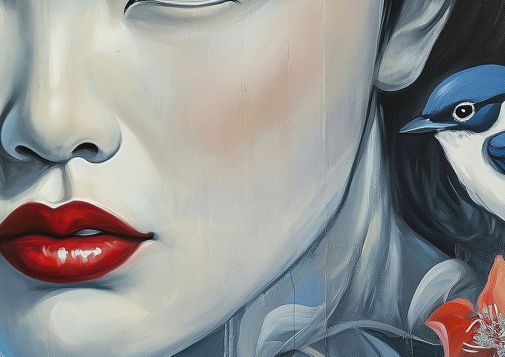 Het schilderij toont een indrukwekkend schilderij van een Aziatische vrouw, gekenmerkt door haar opvallende rode lippen en expressieve ogen. Haar zwarte haar elegant opgestoken. Een delicate blauwe vogel rust in het frame. De achtergrond is diep, donkergrijs en blauw, waardoor de vrouw nog meer in het oog springt. Voor haar bloeien bloemen, die een prachtig contrast vormen met de sobere achtergrond. De combinatie van het serene gezicht van de vrouw, de levendige vogel, en de florale elementen op de voorgrond geeft het geheel een mysterieuze en bijna dromerige sfeer.