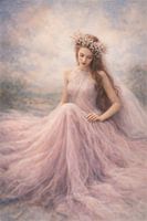 Een verstild en dromerig portret waarin zachtheid en kracht samenvloeien. De vloeiende pasteltonen en lichte texturen creëren een tijdloze sfeer die rust, elegantie en emotie uitstraalt. Een werk dat ruimte laat voor eigen interpretatie en moeiteloos een serene aanwezigheid brengt in elke omgeving. De vrouw draagt een delicate,…