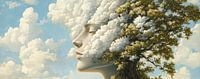 Silent Nature's Whisper - Dit surrealistische schilderij toont het gezicht van een vrouw met gesloten ogen, naadloos overgaand in de uitgestrekte takken en bloemen van een weelderige boom tegen een achtergrond van levendige wolkenluchten.