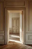 ‘Silent Passage — nr. 02’ is een warm, zacht-beige interieurbeeld waarin klassieke deuren, houten visgraatvloeren en subtiel vallend daglicht samenkomen in een compositie die bijna tastbaar rustig is. De scène voelt als een scène waarbij de tijd heel even vertraagt — alsof er net iemand door deze ruimtes bewoog, of alsof er zo een nieuwe aanwezigheid binnen kan stappen. Het spel van deuren in lijn, de gelaagdheid van panelen en de verfijnde, bijna historische detaillering creëren een atmosfeer die zowel elegant als intiem aanvoelt. Niets schreeuwt — alles fluistert.